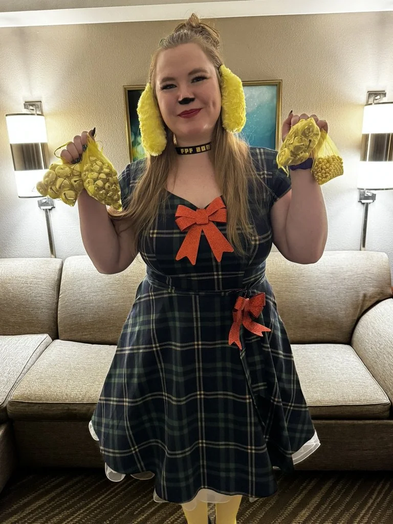 Mayor Pauline cosplay debuted December 2023. Sewed the dress and modified the hat.