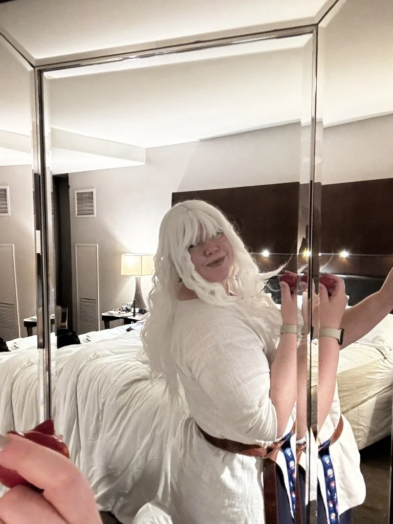 Griffith cosplay debuted August 2024. Sewed all aspects of cosplay. Wig styled by me. Behelit created by me. Boots & belt purchased.